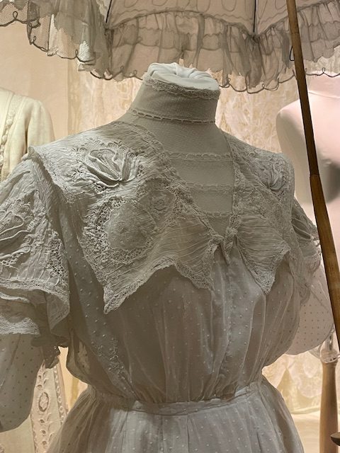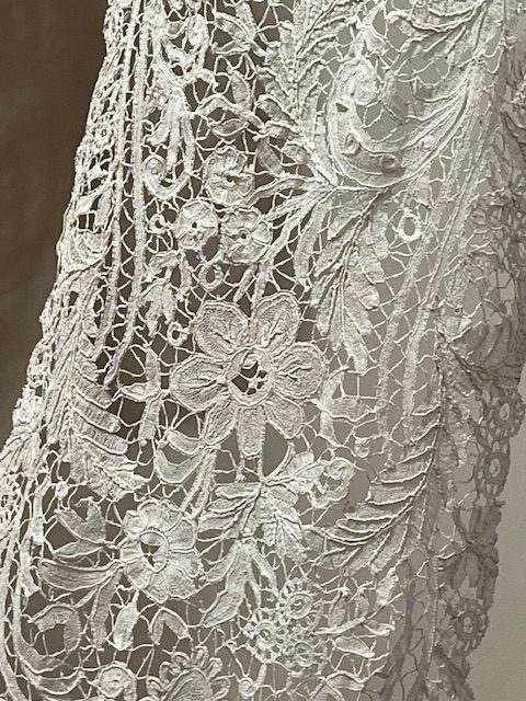 そしてうっとりするレースを使ったアンティーク・ドレス。立体的な肩下のバラ模様がまた豪奢で美しいドレス。(来世にはこんなドレスを着れる機会がありますように・・・)
