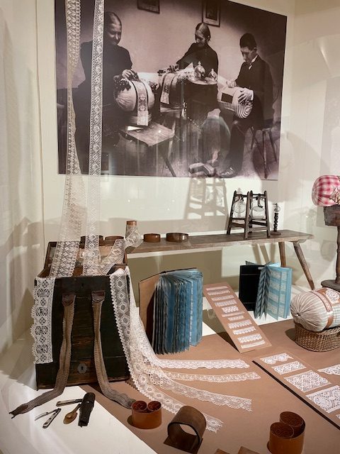 写真で見て解りますように、枕のような丸いクッションを膝に乗せ、糸を針で固定しながらボビンを交差させて、レースを完成させます。左下にあるのは、行商人の担いでいた木箱。(富山の薬売りのような感じ。)冬の始まる前に商品見本を持って行商、その場で注文を受け、その注文を冬の間にヴァンベルクの職人さんたちが仕上げます。雪の溶ける頃にまた発注先に完成したレースと新しい商品見本を持って、参上するという仕組みだそうです。