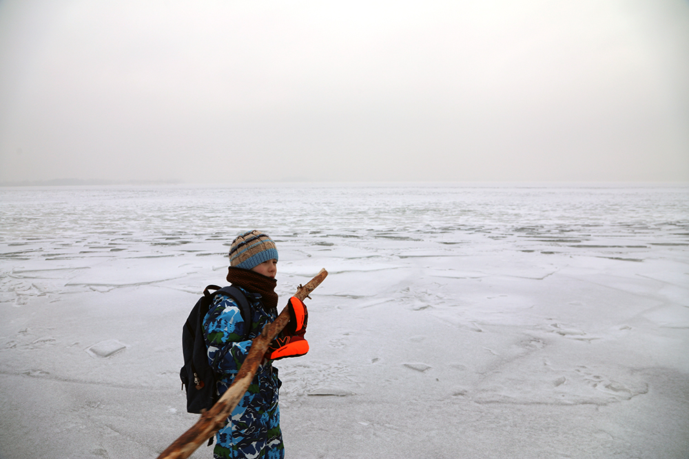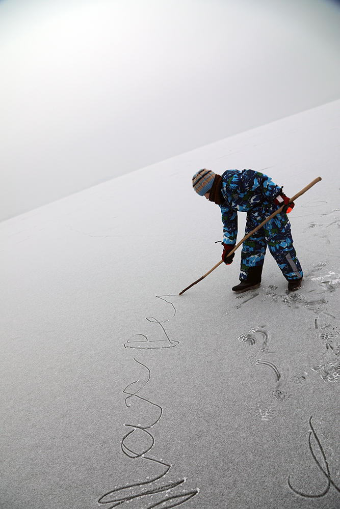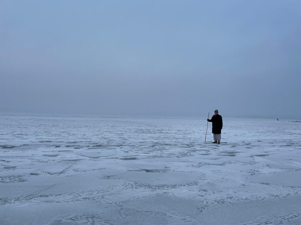 行った場所は我が街ナーホドから車で10分ちょっとのところにある大きな人工池(貯水ダム)、ロシュコシュという湖です。池がここのところ続いた寒さで全面凍っていて、そんな時にはアイススケートを楽しむのがいいんだということで・・・。実際到着すると、流氷??というような水面が割れてまた固まった氷のストラクチャーのラインだけが見えるホワイトアウトの世界。一面白、白、白のモノクロームの壮大な景色が広がっていました。しかも誰もいないし、ステートやってる人。
