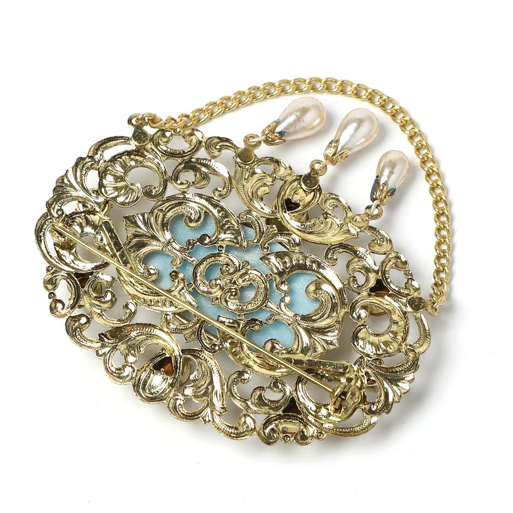 こちらはチェコスロヴァキア時代のヴィンテージブローチ。大変大振りの6.6cmもあるブローチです。中央に楕円形のクリームグリーンのガラス石がはまっています。台座はフィリグリーのカーブの効いた植物紋様の豪華な台座。周辺にはカットガラスとイミテーションパールがあしらわれています。チェーンの垂れと雫型のイミテーションパールの垂れもさらに豪華な印象を添えます。大きめの色の濃いめのコートなどに使うとエクストラヴァガントでおしゃれです。沢山のスタイル&デザインのビジューが存在するチェコならではの一品です。