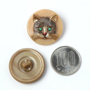こちらは猫のお顔のガラスボタン。カフェオレ色のガラスを使用したものです。表面全体に猫のお顔、ペイントももちろん丁寧に手作業で行われています。こちらは緑の瞳の黒猫さんです。耳と髭は金色でおしゃれ。への字ぐちのキョトンとした表情と赤いお鼻がとても愛らしい猫さんです。猫好きにはたまらないボタンです。ブローチや髪留め、留め具など使い方はいろいろです。工房からの新品です。