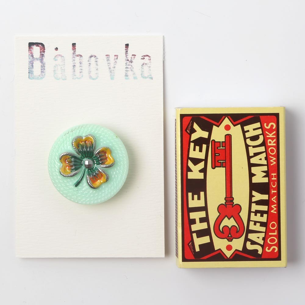 こちらは北チェコのガラスボタン工房で作られている手打ちボタン。こちらのボタンは直径が約2.7cmあります。一つ一つ手作業による手打ちで行われ、手間をかけ彩色ももちろん手作業で行なわれています。こちらはクローバーのモチーフで貴重なウランガラスのボタンで、クリームグリーンのガラスです。金彩も素敵なアクセントになっています。大きさも2.7cmと大きくブローチのような貫禄があり留め具などにすると素敵です。工芸品のようなボタンですので、髪ゴムのチャーム、帯留めなどにリメイクするのもありです。