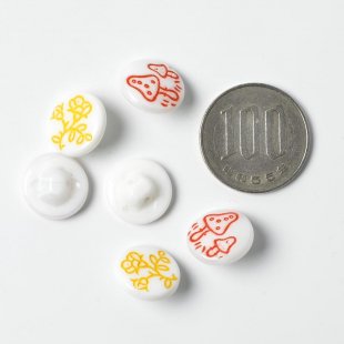 こちらはチェコスロヴァキア時代の子供ボタン。乳白色のガラスに黄色い野薔薇と赤いキノコの2つのお柄で6個セットです。ほっこりとするキュートな柄でパステルカラーの布によく合います。シャツや飾りのボタンにいかがでしょうか。1980年代までの古いものです。