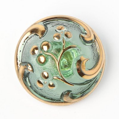こちらは北チェコのガラスボタン工房で作られている手打ちボタン。こちらのボタンは直径が約2.2cmのボタンです。こちらのボタンは、透明のグリーンのガラス製で、中央が盛り上がったポッコリとした形のガラスボタンです。表面にはカーブが特徴的なバロックスタイルの植物モチーフが金彩で施されています。ガラス独特の質感も楽しめます。一つ一つ手作業で手間をかけて作られたガラスボタン。ブローチのような貫禄と華やかさがあり、髪飾り、留め具などにも素敵です。帯留めなどにリメイクするのもありです。もちろんジャケットやコートにも。存在感のあるとっておきのチェコのお手製ガラスボタンです。
