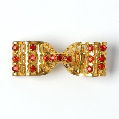 こちらはチェコスロヴァキア時代のヴィンテージ・ビジュー。ゴールドの金属プレートでリボンのモチーフの華やかなブローチです。表面には発色の良い真っ赤なカットガラスがあしらわれ、キラキラと輝きます。立体的な作りになっています。ピンなどの状態も含めて状態はいいものですが、リボンの下の層に一部変色とメッキのハゲが見られます。写真でご確認ください。コートや帽子のアクセントにするととてもキュートです。