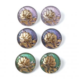 こちらはチェコのガラスボタン工房で製作されている手打ちのガラス・ボタンです。直径が約1.8cmあります。一つ一つ打ち出しや彩色も職人さんの手作業で行われています。透明のガラスを使用し、裏面から金属塗料が塗布されていますので、奥行きのあるお色をしています。こちらはデザインが同じで色が違う3色の6個セットです。柔らかなお色の優雅なお花のモチーフが美しいボタンです。(裏面はきわにごく小さな凹みが見られるボタンがありますが、その上から金属塗料が塗布され、ボタン工房からは普通に出荷される商品です。)