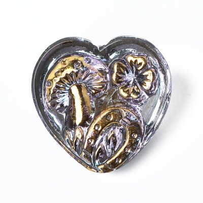 こちらは北チェコの工房で手打ちで作られているガラスボタン。ハート形で表面には、クローバーと馬蹄、キノコの正統ラッキーアイテム勢揃いのおめでたい:)ボタンです。ラブリーさ満点でチェコでの日本でも人気のあるガラスボタンです。裏から金属塗料が塗布され、グレーブルーのお色、表面には金彩も施されています。存在感抜群の人気アイテムです。こちらは1.7cmのサイズのボタンです。洋服のボタンにもおすすめですが、イヤリングなどのアクセサリーに加工されるのもおすすめです。