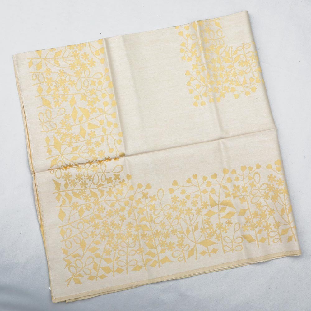 こちらはチェコスロヴァキア時代のジャガード織のテーブルクロス。100x100cmの正方形のものです。モラヴァレンというかつての国営企業からのものです。そちらの国営企業ではたくさんの良質なリネンや綿布の製品が生産されていました。(今ではもう存在しません。)こちらは淡いイエローのお布に野の植物の模様が刺繍で入っています。ジャガード織特有の光沢が華やかです。こちらでも高級な布製品として特別なシーンに使われることが多いジャガード織。リビングなどに使われると高級感と生活感があり空間を華やかに演出できます。デッドストックの未使用品で状態も新品のようです。当時の包みに入ったままでお届けいたします。