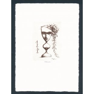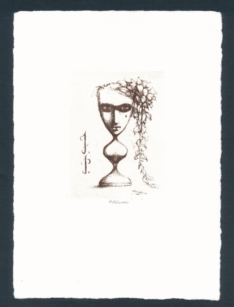 こちらはチェコの画家でイラストレーターのルドミラ・イジンツォヴァーのエッチング作品です。12.5x 17.8cmの大きさの紙の中央に6x8cmの範囲で、女性のポートレイトが描かれています。イジンツォヴァーは日本でも出版された『白鳥の湖』のイラストを手がけたことでも知られるチェコのイラストレーターで、静謐で荘厳な雰囲気の美しい女性画を多く残しています。こちらはアイマスクをかけたような女性と杯がモチーフになったちょっと不思議な雰囲気の作品です。イジンツォヴァーらしい一枚と思います。モデルの女性のイニシャルと思われるF・Pの文字も入っています。鉛筆で版画の下部に小さく本人自筆のサインが入っています。こちらのでも人気のコレクターズ・アイテムです。紙に一部薄い折れ線があります。額に入れて日々の生活でお楽しみ頂くのもおすすめです。