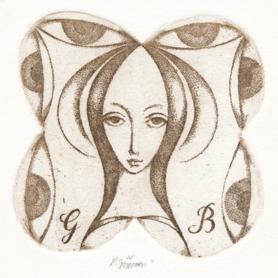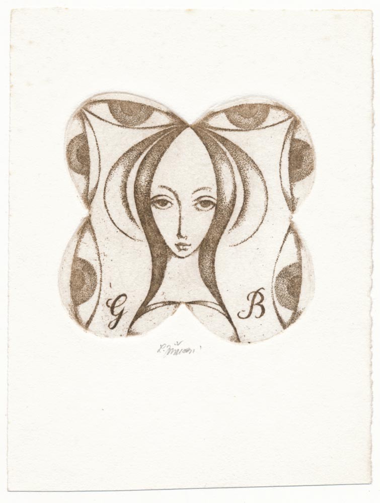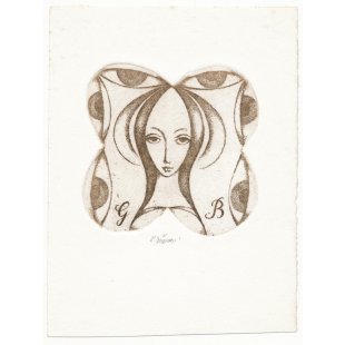 こちらはチェコの画家でイラストレーターのルドミラ・イジンツォヴァーのエッチング作品です。10x13.4cmの大きさの紙の中央に約7.5x7.5cmの範囲で、女性のポートレイトが描かれています。イジンツォヴァーは日本でも出版された『白鳥の湖』のイラストを手がけたことでも知られるチェコのイラストレーターで、静謐で荘厳な雰囲気の美しい女性画を多く残しています。彼女のイラストによく登場する三白眼の女性のイラストで、さらにその三白眼が彼女の周りを囲んでいます。こちらを見据えるような強い視線が印象的で不思議な雰囲気のイラストです。元々女性のポートレイトとして制作されたようで、G.Bとイニシャルが入っています。また本人直筆の署名も入っています。状態も良好です。額に入れて飾ってお楽しみ頂くのもおすすめです。