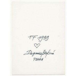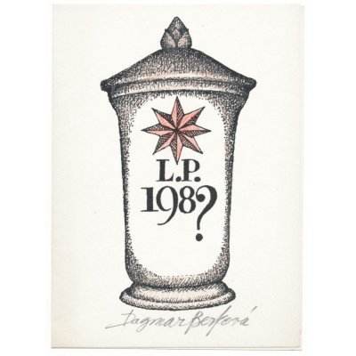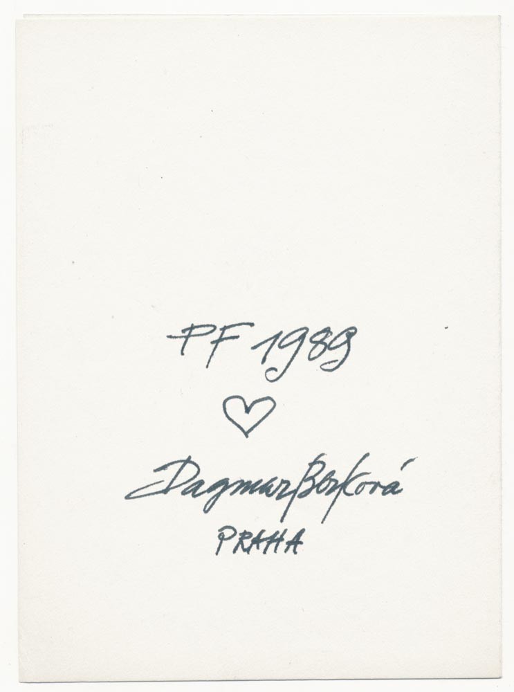 こちらは国内外で人気のイラストレーター、ダグマル・ベルコヴァー(1922-2002)のグラフィック作品です。PFとかいてありますので、年賀状で1989年ビロード革命の年の記載があります。八芒星の書かれたボンボニエールのような容器に198?と書かれています。遊び心を感じる作品です。リトグラフ印刷の上から手書きで赤い色鉛筆で色付けされています。見開きの紙の右側にグラフィック、左側に署名が入っています。若干の色焼けが見られます状態はおおむね良好です。
