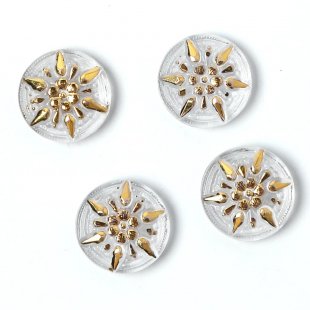 こちらは北チェコのガラスボタン工房で作られている手打ちのガラス・カボションです。こちらのカボションは直径が約1.3cmあります。一つ一つ打ち出しや彩色も職人さんの手作業で行われています。クリアガラスを使用したカボションで表面には雪の結晶のモチーフに金彩が施されています。ガラス自体の質感もお楽しみいただけます。涼しげでクールな雰囲気のカボションです。現地チェコからのとっておきです。こちらは2個売りですのでご留意ください。裏には糸通しのリングがないため、アクセ・パーツとして使用される方には大変便利です。