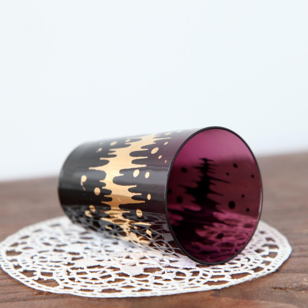 こちらは50-60年代のチェコスロヴァキアの小さなショットグラス。チェコの人が今でも誇りにしているブリュッセル国際万博'58の頃を彷彿とさせるデザインでコレクターズアイテムになっています。近未来的なレトロデザイン。薄手の紫のガラスに金色の装飾がプリントされています。今となってはなかなかないこのチェコレトロデザインが、オンリーワンな雰囲気で可愛らしいショットグラス。(かなり小さいサイズです。)とんがったデザイン性の高さがインテリアとしてもおすすめです。金色のプリントに製造時のものと思われるムラがあります。こちらでも人気&入手困難なレアアイテムです。