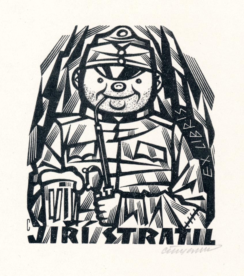 ヴォイテェフ・チニブルク(1915-1994)はチェコの画家、また人形作家でもあります。本や絵本の挿画も沢山残しています。またチェコスロヴァキア時代には切手のデザインも手がけています。こちらはその彼の木版画による蔵書票で、イジー・ストラティルという人物のために制作されたものです。モチーフはチェコファンにはお馴染みの『良き兵士シュべイク』ヤロスラフ・ハシェク著の物語のメインキャラクターです。パイプとビールを手に持って、満足そうな表情が楽しいシュベイクのイラストです。本人直筆署名入りです。額に飾ってお楽しみ頂くのもおすすめです。