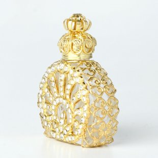 こちらはチェコのガラス製香水瓶で昔から作られているチェコスロヴァキアでは定番の商品。ガラスを型にはめてフォーミングする製法で作られています。また、北チェコの工房で一つの家族が丁寧に手作業で製作している工芸品的な香水瓶です。透明なガラスを使用した瓶にレースのようなゴールドの金属カバー、孔雀のフォルムを思わせる放射状で、カットガラスが沢山あしらわれた豪華な出来映えです。また蓋には内部にガラス棒が付いていて香水に浸る感じになります。お気に入りの香水を小分けにして携帯することも可能です。また、棚などに飾ると華やか抜群で可愛らしいインテリア・アイテムになります。新品&ノスタルジックな香水瓶、とてもチェコらしい一品です。またプレゼントとしてもおすすめです。