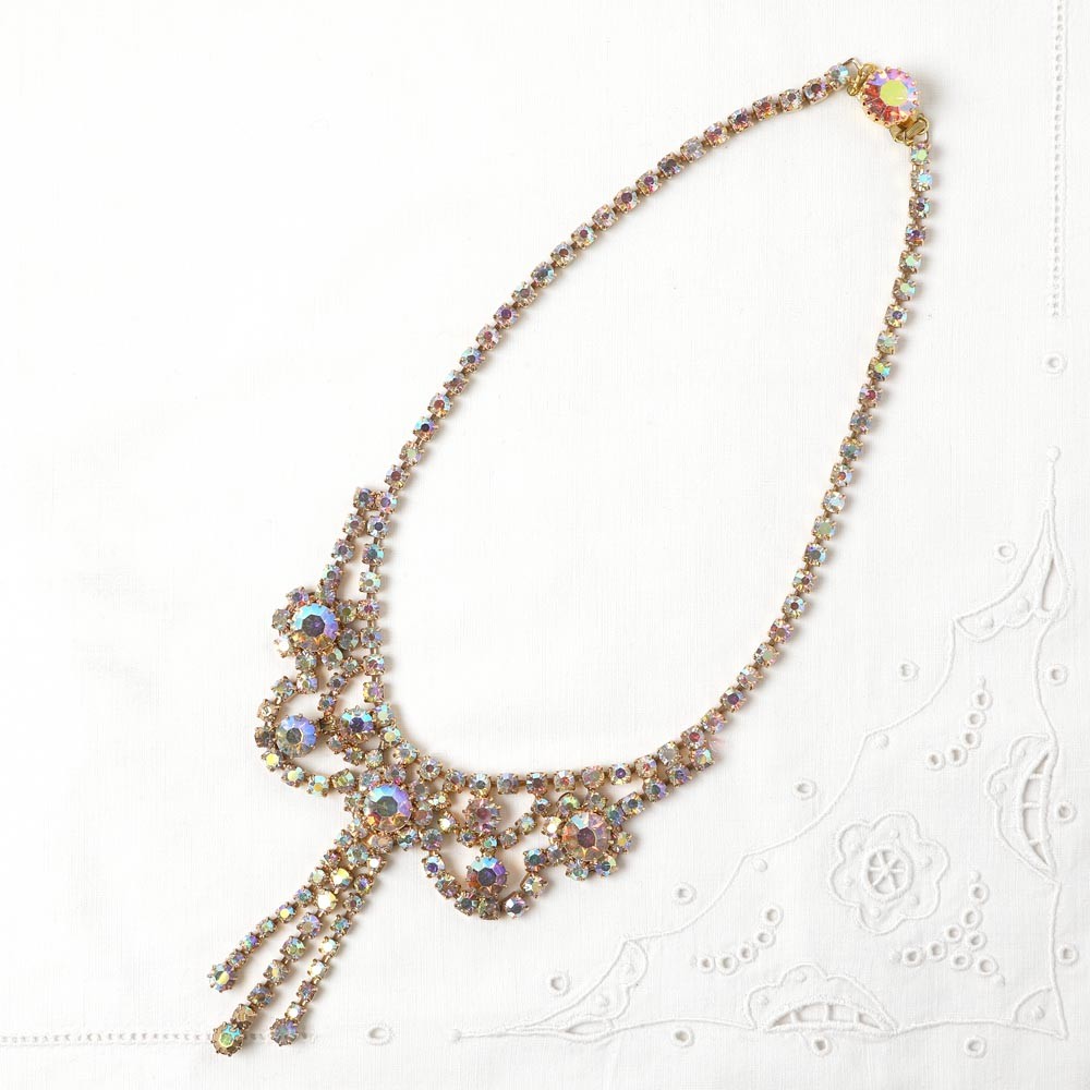 こちらはチェコスロヴァキア時代のラインストーンのガラスのネックレスです。大きめのガラス石(4mm)が使われたラインストーンで全体的にも大振りです。中央にはお花のようなモチーフが繰り返され、豪華な雰囲気の中にもキュートさが感じられます。ガラスの表面には金属塗料が塗布され、虹色に輝き華やかさ抜群です。フォーマルな場面にもおすすめできる存在感。留め具は古いものでしたので、同じような形式の新しい留め具と替えてありますので、オリジナルの状態より使いやすくなっております。チェコスロヴァキアならではのお品かと思います。状態もとても良いヴィンテージです。