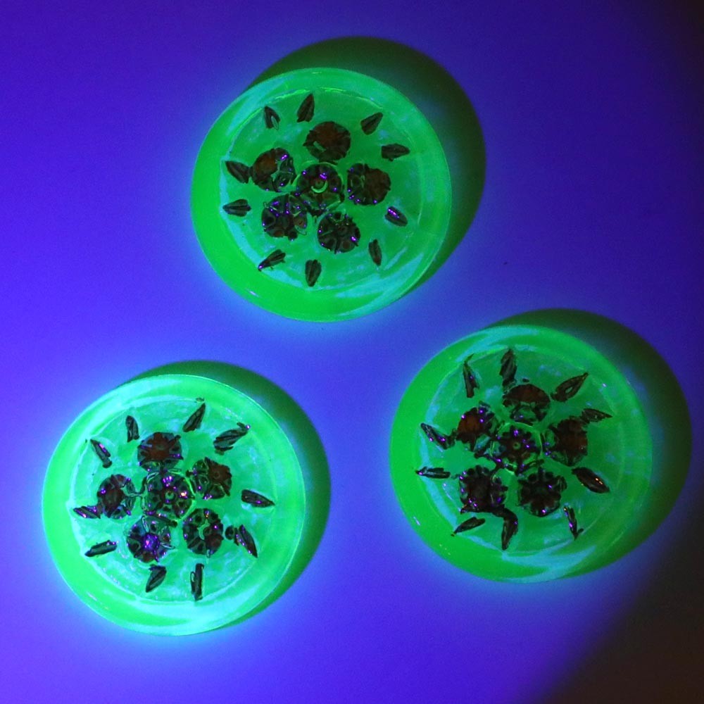こちらはチェコのガラスボタン工房からのカボション。ウランガラスを使用したイエローのガラスカボションです。中央に金彩でブーケの模様が施されている華やか&爽やかな仕上がりです。ガラス自体の質感もお楽しみいただけます。2つセットでの販売です。