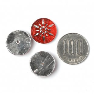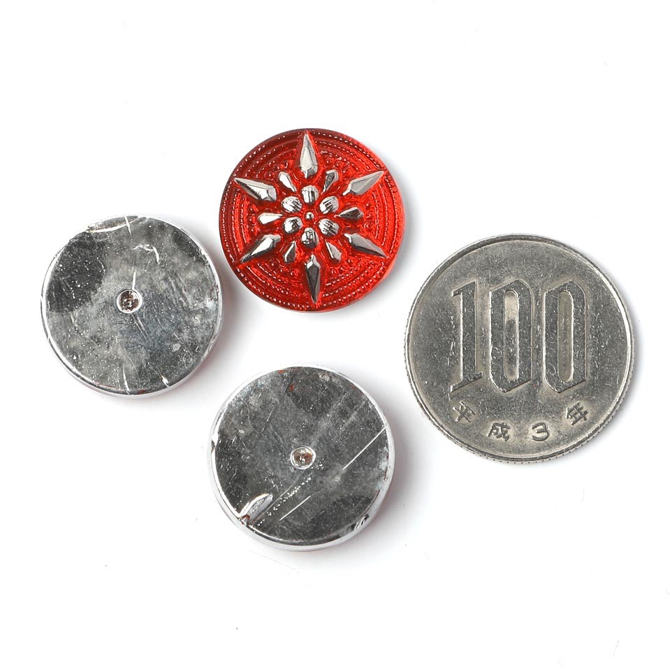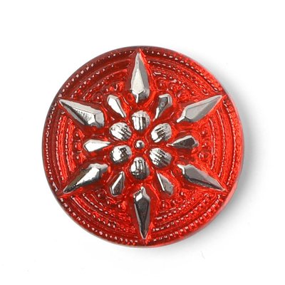 こちらは北チェコのガラスボタン工房で作られている手打ちカボション。こちらのカボションは直径が約1.8cmあります。一つ一つ打ち出しや彩色も職人さんの手作業で行われるカボションです。表面に雪の結晶のような模様が銀彩で施され、赤いお色のカボションです。裏から金属塗料が塗布され、奥行きのある輝きを持ちます。個性的で、クールな印象の美しいカボションです。こちらは一個売りのお値段です。