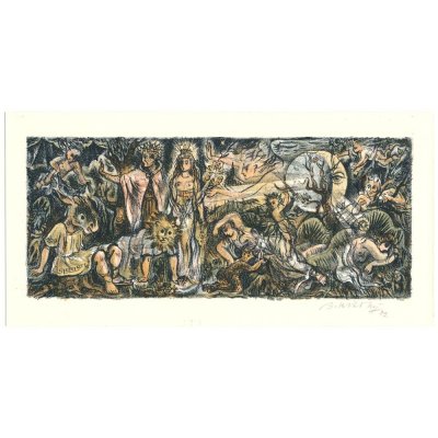 こちらはボフミル・クラートキー(1913-2005)の制作したグラフィック作品。ボフミル・クラートキーはチェコの画家でイラストレーターです。寓意的な絵画やシュールな作品を残し、蔵書票やリトグラフ作品も数多く残しています。こちらは10cmx20cmのグラフィック作品で、ウィリアム・シェークスピアの『真夏の夜の夢』を題材にしたものです。森の妖精王オーベロンと女王ティターニア、また森の妖精たちが描かれたカラーのリトグラフ印刷です。頭をロバに変えられた職人や、媚薬を持つキューピッドなど画面いっぱいに登場人物が描かれたなかなかの大作です。本人直筆署名入り。1972年の作品です。