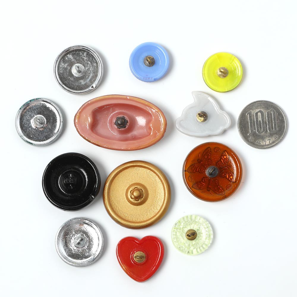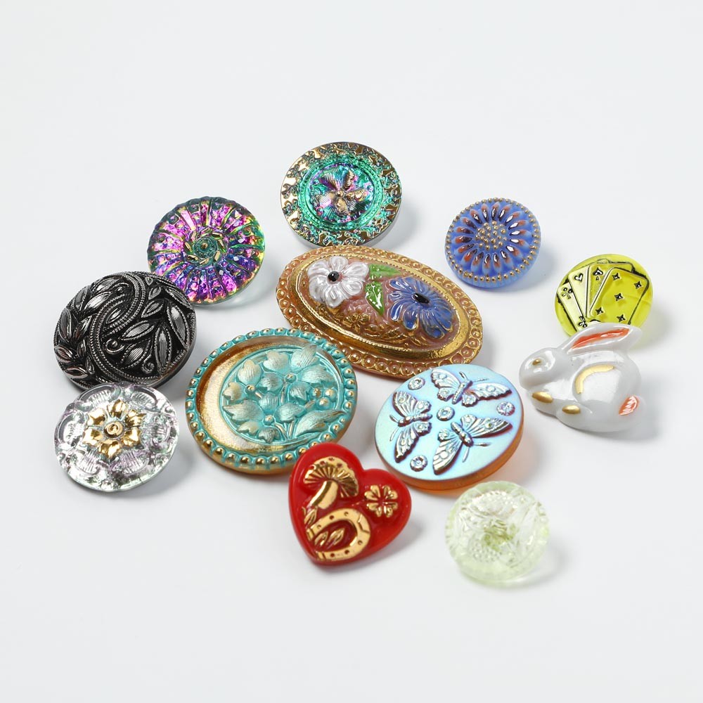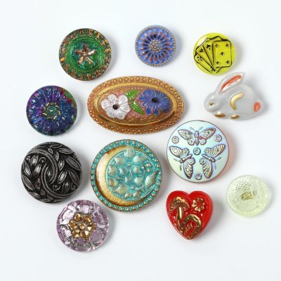こちらは北チェコで長い間製造されてきたガラスボタンで、ひとつひとつ手で打ち出され彩色も職人さんによる手作業でのもの。手に取って頂けると美しいブローチのような貫禄たっぷりのボタンの王様。今回はいろいろな種類のボタンをアソートして12個のセットにいたしました。人気の桔梗と月のボタンや楕円形のボタン(4.2cm)も入っています。また裏から金属塗料を塗布されているボタンも4つあります。奥行きのある光を内側から放つ豪華なボタンです。裏面やきわに小さなかけのあるボタン、また色に少しむらがあるものが混じっていますが、まとめてでお求めやすい価格に手のご提供です。写真をご確認の上お求めください。