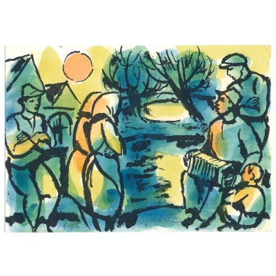 こちらはチェコの画家、アロイス・モラヴェツのニューイヤーズ・カード。1980年のものです。アロイス・モラヴェツ(1899-1987)はチェコの代表的な画家で、チェコの田舎の風俗、民俗を愛し、それをテーマにした絵画を数多く残しました。本の挿絵、また絵葉書、チェコスロヴァキアの切手など、様々なところで彼の作品を目にする事が出来ます。チェコでは広く知られた画家です。こちらの絵は初日の出でしょうか、朝の太陽を拝む村人たちが描かれています。アコーディオンを引く男性もいて音楽を聴いているようです。子供の顔がオレンジに照らされているところがなかなか印象深いイラスト、モラヴェツのチェコの人々に対する愛情が伝わってくる素敵な一枚です。黒い筆で描かれた描画はリトグラフ印刷、その上から水彩絵の具で彩色が施されています。(彩色は実際にハンドペイントで施されたものです。)のどかなチェコのワンシーン、懐かしく明るい雰囲気の素敵なイラストに仕上がっています。鉛筆で直筆の署名も入っています。太陽の付近に一部破れがあります。
