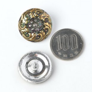 こちらはガラスボタン工房からの新作のガラスボタン。2.2cmの直径で、表面にはふくよかな植物紋様が金彩で施されています。裏からは金属塗料が塗布され、内部から奥行きのあるグリーンやパープルのお色が見えます。個性的で華やかなガラスボタンです。