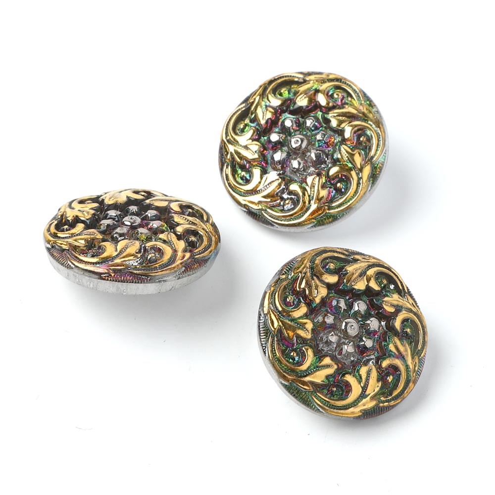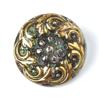 > グリーン&ゴールド ガラスボタン 植物紋様 2.2cm