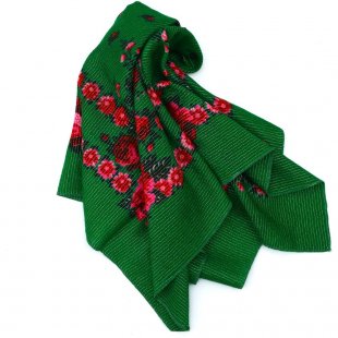 こちらはチェコスロヴァキア時代のヴィンテージスカーフ。1960年代の古いものです。クラシックな民族衣装のバラのプリントのものです。緑のお色の生地に薔薇や菊のお花が所狭しとプリントされた賑やか&華やかな民族衣装のスカーフ。またこちらのスカーフには金糸がストライプで縫い込まれていますので、より一層華やかな雰囲気です。ウールと化繊も混じったお布です。82x82cmの大きめのスカーフで首元にご使用になるのがおすすめです。製造過程で起こったものと思いますが、布の端の11cmに縫いどめがない部分がありますので、お求めやすい価格に手のご提供です。その他状態はよく、穴あきなどはございません。