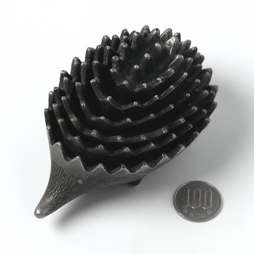 こちらはとっておきの商品、金属製のはりねずみさんの灰皿。チェコのアンティークショップによると50年代のヒット商品。もともとはオーストリアのアーティスト、ウォルター・ボッセのコピー商品として、チェコやロシア製のものがたくさん製造されたといわれています。写真でもお分かりの通りだんだんに小さなはりねずみさんが重なって一つのおおきなはりねずみを形作っています。それぞれのはりねずみさんたち、それぞれの表情が何ともいえない雰囲気を持っています。鉄製でどっしりとした重みがあります。この商品チェコでも人気のコレクターアイテムですが出品が少なくかなりの高値で取引されています。また古い商品ですので一番上の一番小さなはりねずみさんに欠員があることが多く、このように家族全員揃っているのもレア。こちらの商品は元々灰皿としての商品で、お椀の部分に使用された跡や金属の剥げが見られます。写真でご確認下さい。そちらを加味したお値段になっております。こちらは再入荷、貴重なお品です。