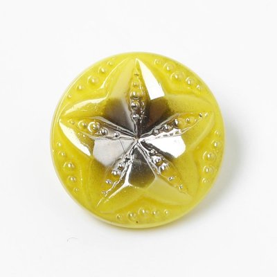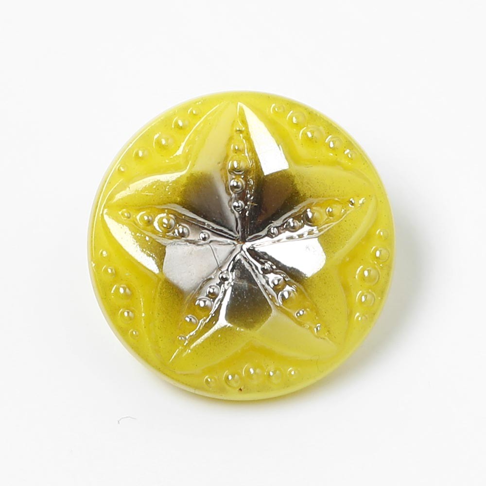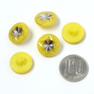 こちらはヴィンテージのイエローのガラスボタン。元々古いボタンカードに縫い付けられていたものです。表面には星のような模様が施され、シルバーの塗料が塗布されていてエレガントでレトロな雰囲気のお品です。チェコスロヴァキアからの良品。1960-1980年代のものです。