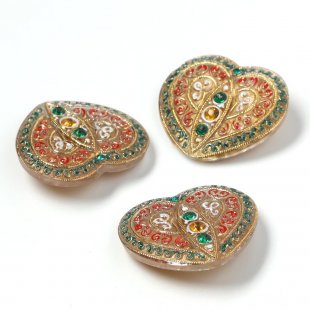 こちらはチェコのガラス工房で制作されている大きなハートのガラスボタン。3.2cmの大きさで裏からはマットゴールドの金属塗料が塗布され、お色はマットゴールド、表面には繊細なゴールドのラインや赤と緑の模様の華やかなガラスボタンです。また中央にはオレンジと緑のクリスタル・カットガラスが配置され、ブローチ顔負けの豪華&可愛いさです。工房からのとっておきのガラスボタンです。