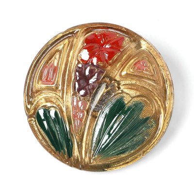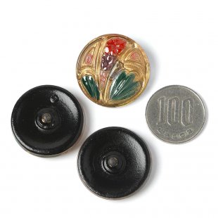 ガラスボタン工房で昔ながらの製法で制作されている手打ちボタン。職人さんの手作りです。ボタンの表面にはアールでこのスタイルで、3色のお花が3つ、また大胆なラインを使った斬新な模様がはいっています。裏から黒い塗料が塗布されています。現行で制作されているボタンですが、型はとても古いものです。ペイントに少しムラがあります。留め具や飾りボタンにおすすめです。ブローチや帯留めなどにするのも、アイディアです。