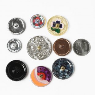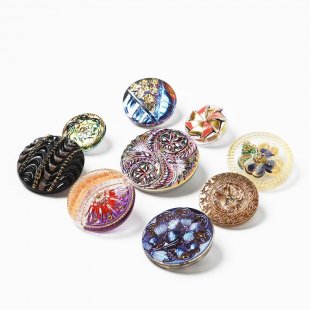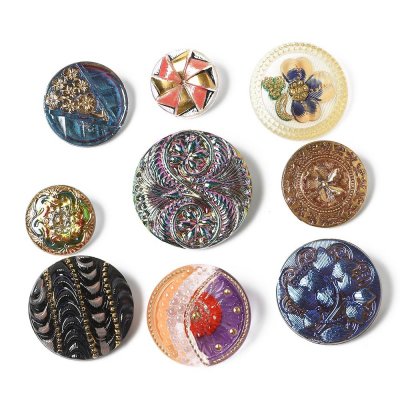 こちらはチェコので長い間製造されてきたガラスボタンで、ひとつひとつ手で打ち出され彩色も職人さんによる手作業でのものです。今回は9個のセットです。4個のボタンが金属塗料で裏打ちされているボタンで、それらのボタンには奥行きのある輝きがあります。デザインがそれぞれ異なり、一つ一つがブローチのような美しい出来です。ごく小さなかけのあるボタンやむらのあるボタンが数個のみ、他は問題のないボタンたちです。写真でご確認の上お求めください。まとめてでお買い得な価格にてのご提供です。