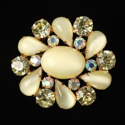 こちらはチェコスロバキア時代のビジューブローチ。黄色を基調にしたガラス石で構成された豪華なブローチです。中央にはミルキーなイエローの楕円のガラス石。花びらのように雫型のミルキーイエローがその周りを囲います。外側にはダイヤモンドカットのクリアイエローのガラス石がキラキラと輝きを放ちます。バランスよく配されたガラスの配置は熟練したビジュー職人さんのセンスの高さを感じます。状態も大変良いものです。1960-1970年代頃のものと推定します。華やかさ抜群、縁起も良さそうな逸品です。