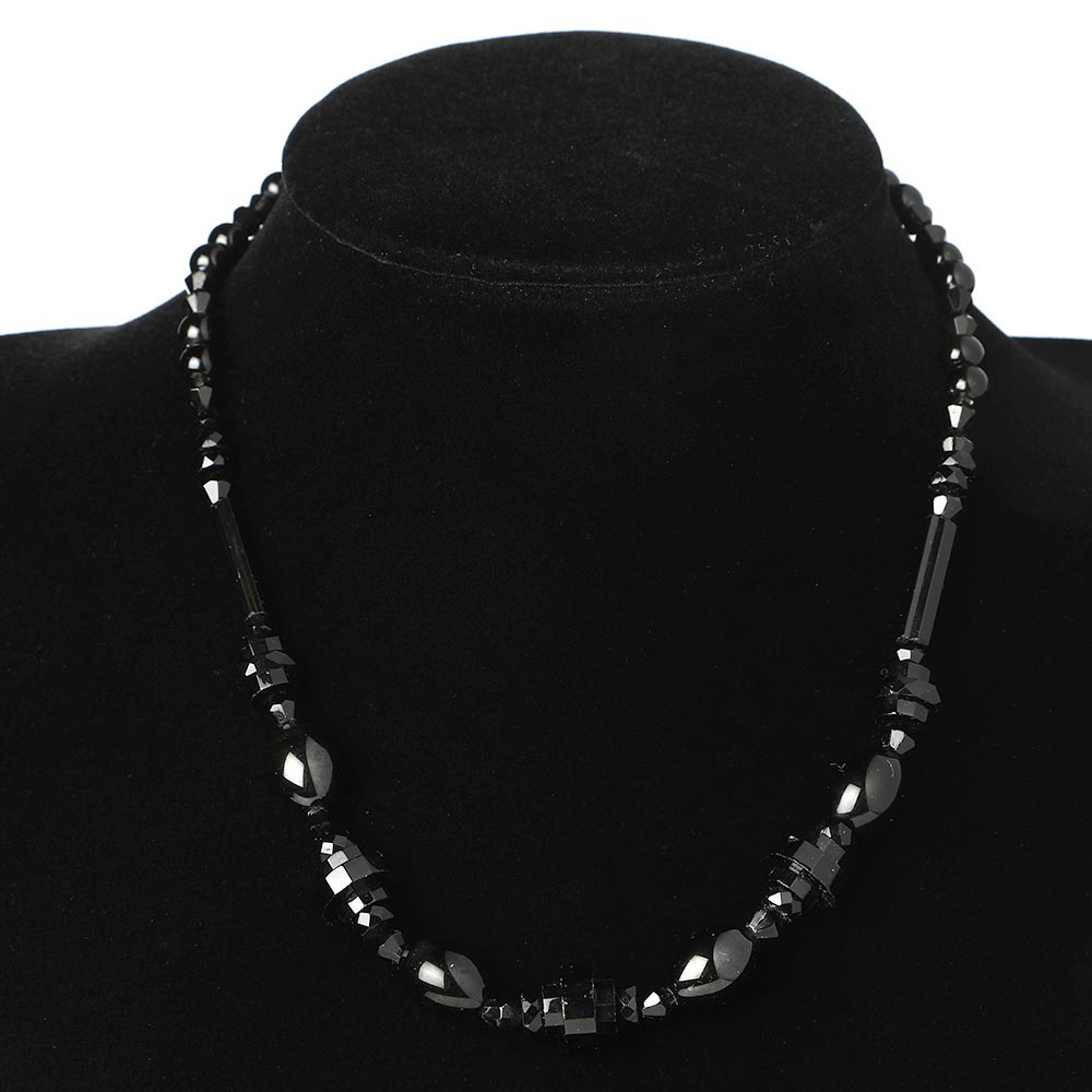 こちらはチェコのガラスのアンティーク・ネックレス。黒ガラス(ジェットガラス)を使ったネックレスです。ジェットガラスは現代では使用できない特殊な薬品を使用していて、黒の濃度が通常の黒いガラスと比べて高く、漆黒の色をしています。太陽の光も通さない黒です。現在では作れないガラスで世の中に残っているだけ・・・。ずばり貴重な商品です。円柱形や小さなビーズはジェットガラス、丸いビーズは白いガラスにジェットガラスの上膜が施されています。さまざまな大きさと形のガラス石がリズム良く配置してあります。実際に装着されると全体にキリッとエレガントでノーブルな印象を与えます。カジュアルでもフォーマルでも色々なシーンで使える良品です。糸とパーツはレストア済みで新しいものに換えてありますので、糸切れの心配もなく安心です。1920年代前後の古いものということでご了承の上お買い求めください。