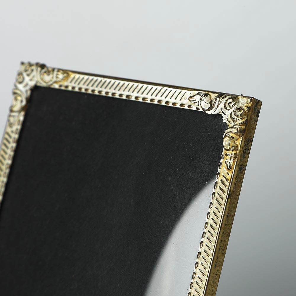 こちらはヴィンテージのチェコスロヴァキア時代のヴィンテージ・フレーム。チェコのアンティークショップでデッドストックの未使用品で入手したものです。フレームは金属製バロックスタイルを思わせる豪華な装飾が施されています。ゴールドの地金にホワイトのペイントが施され、ノーブルな雰囲気があります。ガラス製の窓は緩やかに盛り上がっている本格的で豪華&クラシックな額縁です。古い写真や大切な絵、写真などを入れるのにおすすめです。卓上で使えますが、裏面にフックもついていて、縦位置でも横位置でも壁掛けで使用することができます。状態も良いものです。こちらは裏面にDanish designと印字がありますので、デンマーク製と思います。