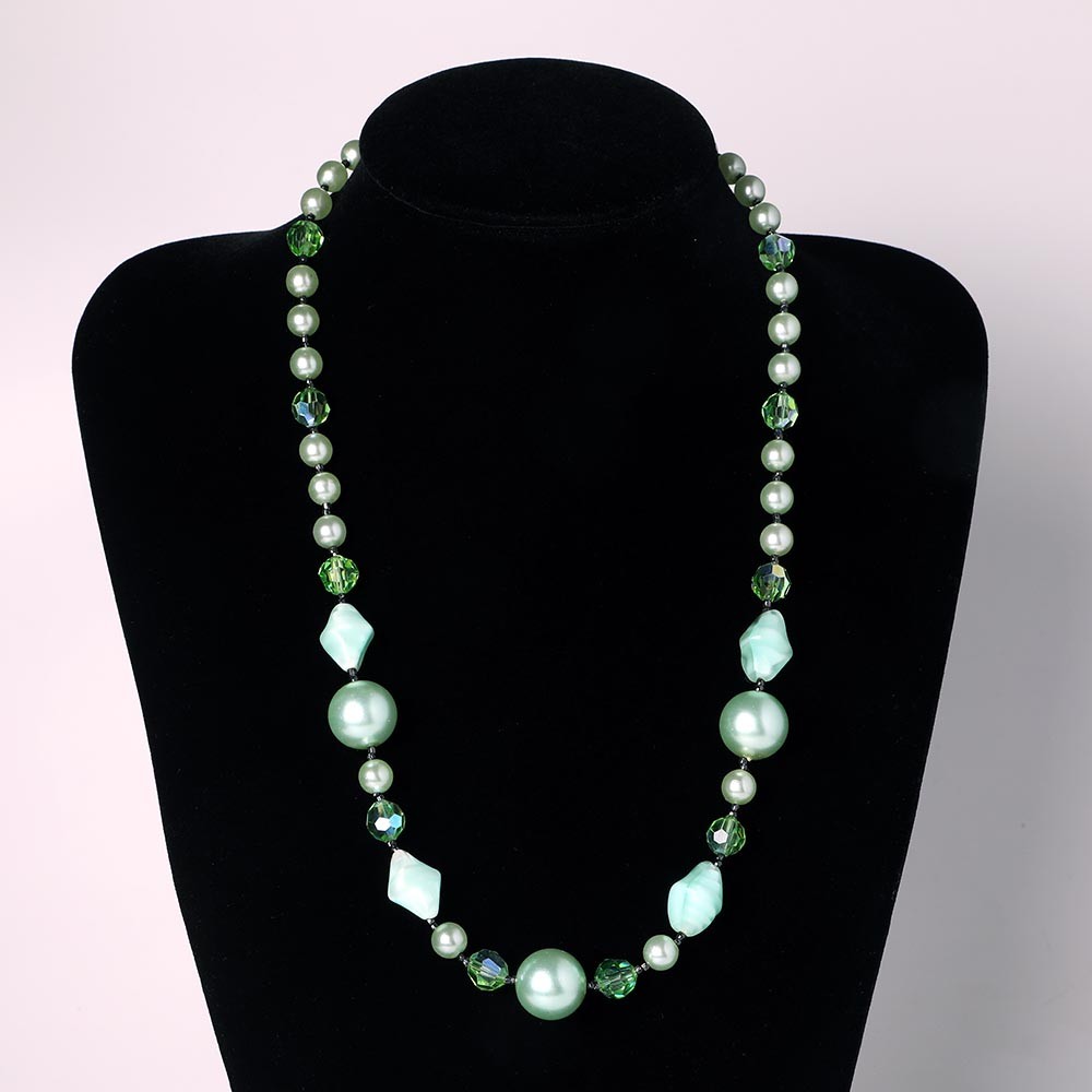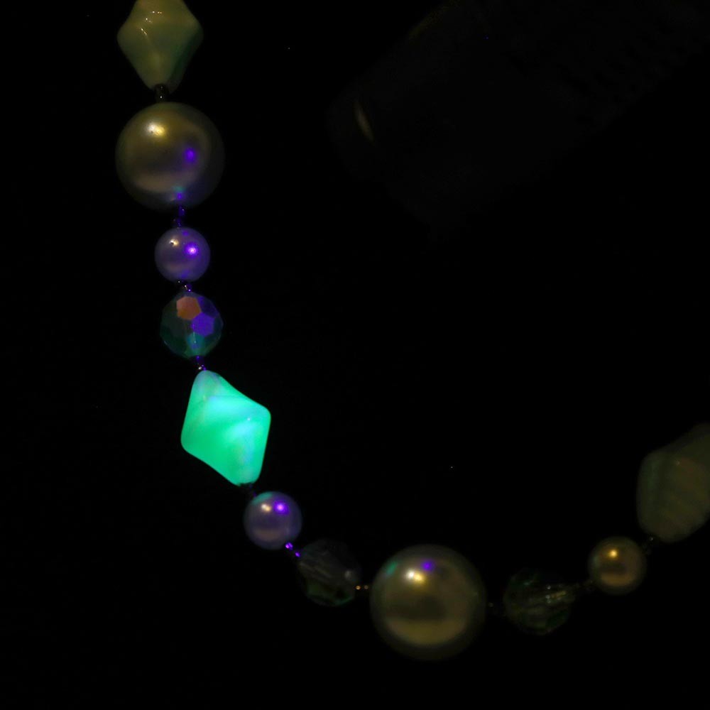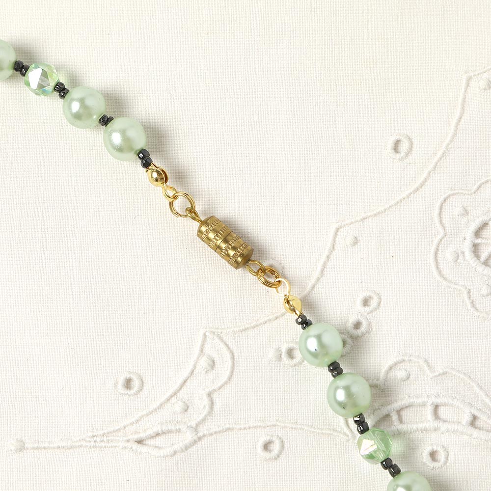 こちらはチェコスロヴァキア時代のヴィンテージネックレス。淡いグリーン系でまとめられた涼やかなネックレスです。大小のシャンパンカラーのラウンドビーズはイミテーションパールを製造する技術で作られたもの、また多面のクリスタルカラスのカットビーズやひねりの入った菱形のビーズはクリームグリーンでウランガラスです。チェコスロヴァキア時代のビジュービーズの技術がつまった美しいお品です。糸は新しいものにレストアしてあります。また留め具は大変状態が良くヴィンテージの雰囲気をなるべく残すために、そのまま使っています。チェコスロヴァキア時代からのとっておきです。