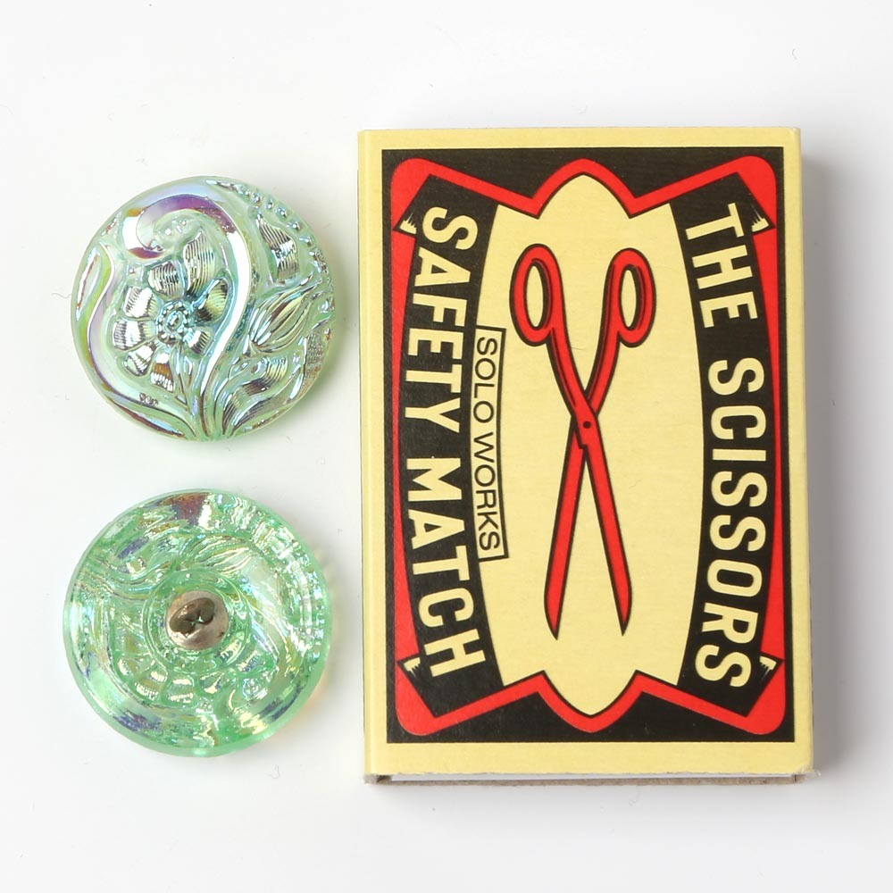 こちらは北チェコのガラスボタン工房で作られている手打ちボタン。こちらのボタンは直径が約2.2cmのボタンです。こちらのボタンは透明グリーンのガラス製ですが、表から薄く金属塗料が塗布され、うっすらと虹色のニュアンスがあります。キラキラとメタリックな輝きです。また表面には優雅な植物文様のモチーフが施されています。華やかな優しい雰囲気が素敵です。一つ一つ手作業で手間をかけて作られたガラスボタンです。こちらも再入荷のお品です。
