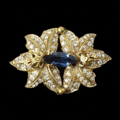 こちらはチェコスロヴァキア1930年代のヴィンテージブローチ。葉っぱが紅葉のように折り重なり、中央にはアーモンド型にカットされた瑠璃色のガラス石があしらわれています。葉っぱの表面には細かなカットガラスが散りばめられ、ゴージャスな仕上がり。90年近く古いほとんどアンティーク、大きいものではありませんが、重さを感じ重厚な雰囲気も。甘すぎずキリッとした大人の雰囲気も魅力です。状態もとても良いものです。
