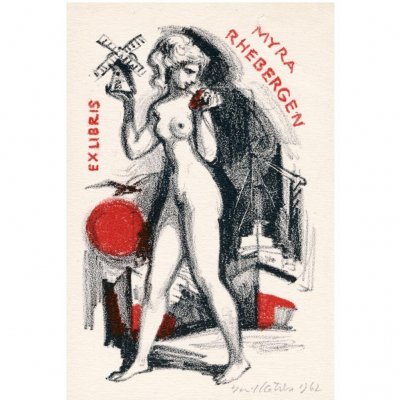 エミル・コトゥルバ(1912-1983)はチェコの画家でイラストレーター。チェコのウィキペディアにも紹介されています。1933年に最初の展覧会を催した若き天才で、カレル・シュヴァビンスキーとも交友がありました。こちらはミラ・レーベルゲンという人物のために制作されたリトグラフの蔵書票です。片手に風車、片手には真っ赤なバラ、背景には大きな船が描かれた女性のヌードでちょっとコケティッシュな雰囲気です。赤いカラーが素敵なアクセントになっています。1962年の作品で本人直筆署名入りです。小さめのグラフィック作品です。