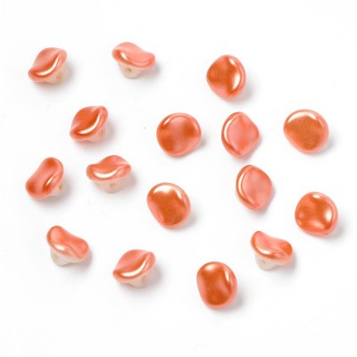 こちらは1960-70年代のヴィンテージのガラスボタン。チェコスロヴァキア時代のものです。乳白色のガラスで、直径は約1cm、小さいながら丸に波打つような加工が施された楽しい形のボタンです。表面にはシャンパンピンクの塗料が塗布されています。少々オレンジ色のニュアンスも見られます。この塗料は先の鋭いもので強く擦ったりすると剥がれてしまうことがありますので、ご留意ください。アクセサリーなどの材料にもおすすめです。デッドストックで入手した状態も良いものです。華やかなお色が魅力です。