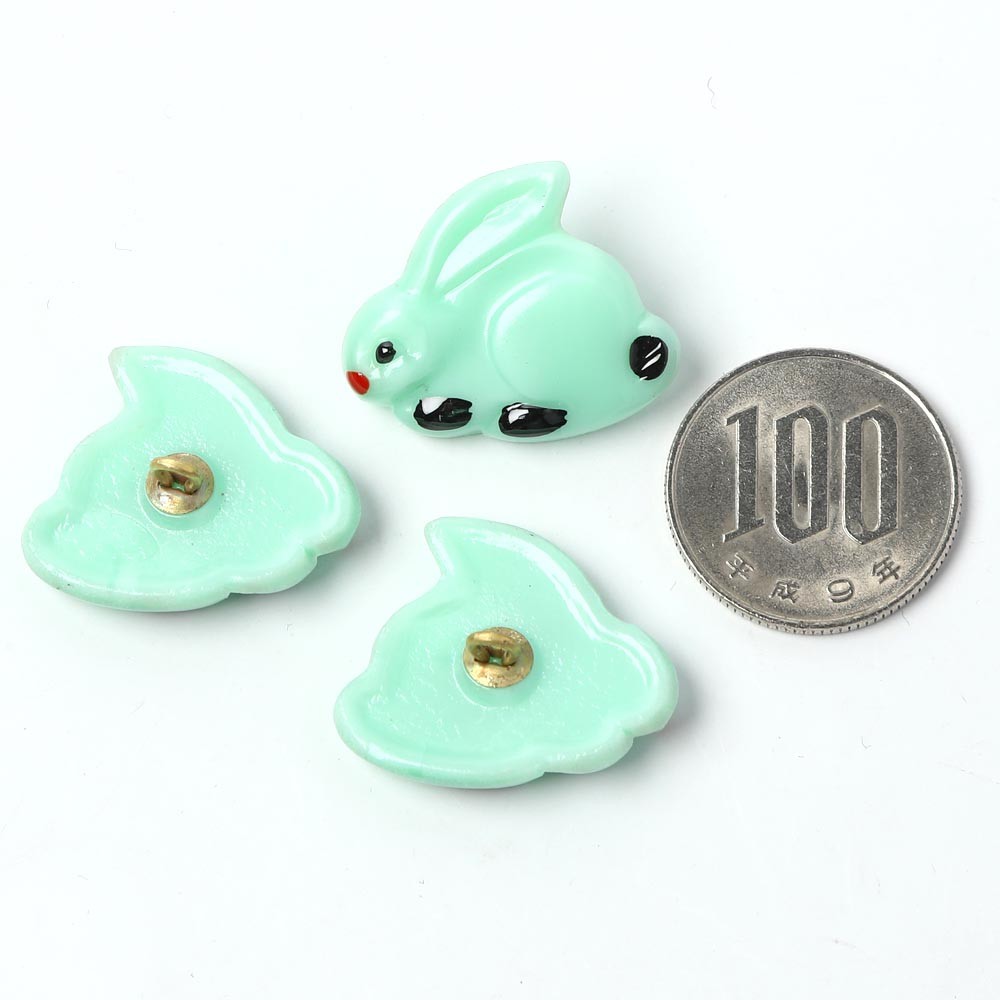 こちらは北チェコのガラスボタン工房の手打ちのウランガラスボタン。うさぎのモチーフのとても可愛いボタンです。おっとりした表情が魅力、こちらはクリームグリーンのうさぎさんです。もちろん塗料は手作業で塗られています。そのためひとつひとつ表情が異なります。また複雑な形を手作業で研磨している手間のかかったガラスボタンです。ウランガラスですので、ブラックライトに反応して発光します。チェコからのとっておきの一品です。