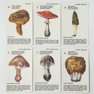 こちらはカルテットというカード遊び。32枚のキノコのカードが含まれています。8つのキノコのグループにはそれぞれ4種類のキノコ、ババ抜きのようにその4つのキノコ全種類を集めていくというようなカード遊びです。こちらのカードは箱入りで箱には傷みが見られますが、カードの状態は良好です。昔の印刷の風合いが美しく、キノコのイラスト自体もとても素敵なカードです。イラストの下には細かなキノコの説明が記載されています。