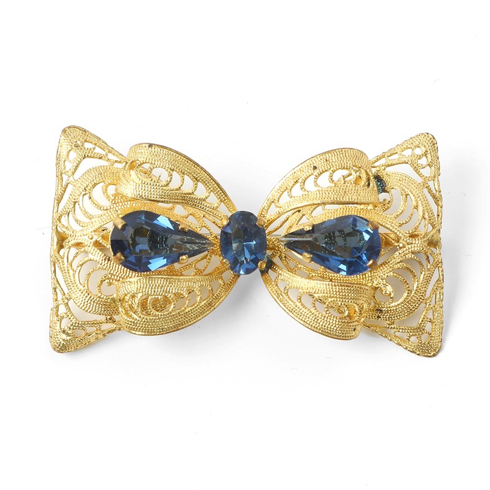こちらはチェコスロヴァキア時代の古いヴィンテージ・ブローチ。フィリグリーという名前で知られる製法で作られたチェコスロヴァキア時代のブローチです。細い金属のワイヤーを使い成形していくもので、こちらでもフィリグランと言う名前でも知られています。印象的な濃いブルーのカットガラスが使用され、針金で描く水の波紋のような模様が繊細で美しいブローチです。またブローチは立体的なリボンのデザイン。昔懐かしい雰囲気もございます。1950-60年代のとても古いものですがデッドストックの未使用品で状態もとても良いものです。こちらも乙女心のあがるチェコスロヴァキアのとっておきおすすめヴィンテージです。