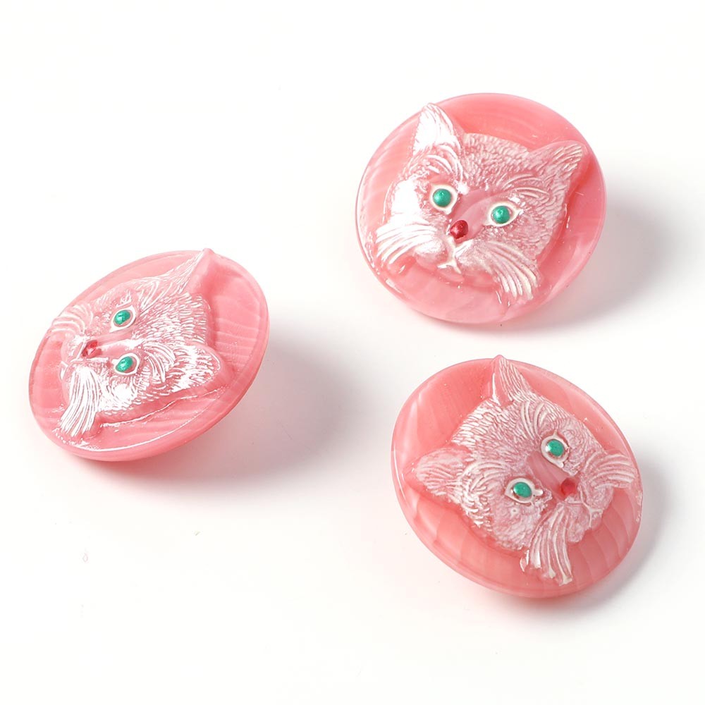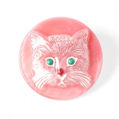 こちらは猫のお顔のガラスボタン。不透明のピンクのガラスを使用し、表面全体に猫のお顔、ペイントももちろん丁寧に手作業で行われています。ガラスには少しマーブルが入っています。こちらはへの字ぐちのキョトンとした表情が愛らしい白猫さんです。猫好きにはたまらない大変キュートなボタンです。ブローチや髪留め、留め具など使い方はいろいろです。工房からの新品です。ピンクのガラスは他のお色のガラスよりも高価な材料で、それを反映したお値段になっております。