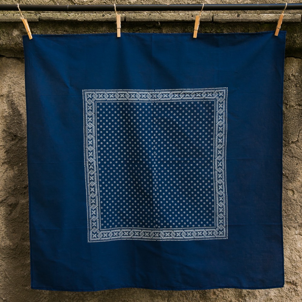 ハンドプリントの藍染の大判スカーフ 87x89cm