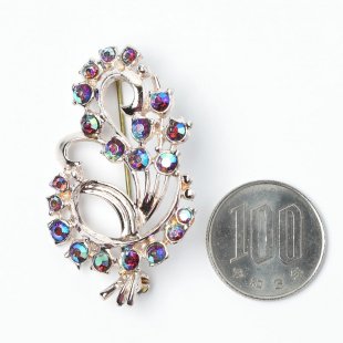 こちらはチェコスロヴァキア時代のヴィンテージブローチ。1980年代頃のものです。植物モチーフの銀の台座に、金属塗料の塗布されたガラス石が配置されています。メタリックブルーのお色で冴えた強い輝きがあります。クールな印象の洗練されたブローチです。ピンの状態も含め全体の状態も良好です。