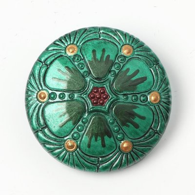 こちらは抽象的なちょっとアールデコの雰囲気を持つデザインのガラスボタン。表面はマットな塗料が塗布され、マットゴールドや赤のペイントが施されています。型自体は古いものですが、現行品です。職人さんの丁寧なハンドペイントで、デザインもユニークなボタンです。