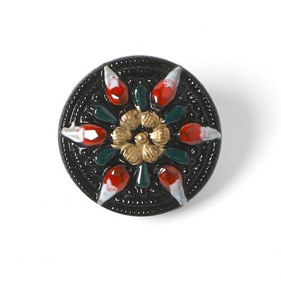チェコのガラスボタン工房からのガラスボタン。1.3cmの直径で黒いガラスを使用し、中央にはゴールドの小さなお花、周りにはお花の蕾のようなペイントが施されています。小さいけれど、キュートで華やかなボタンに仕上がっています。