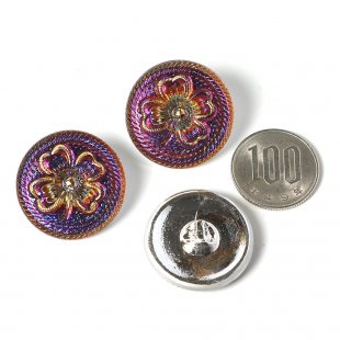 こちらは人気のクローバーモチーフのガラスボタン。裏面から金属塗料を塗布され、奥行きのあるパープルブルーのお色です。また角度によってはピンクやオレンジのお色を見せます。一言では描写の難しいさまざまなカラーを内包します。(手作りですので、色味に個体差がありますので、ご留意ください。)パッと目を引く華やかな存在感がある一品です。